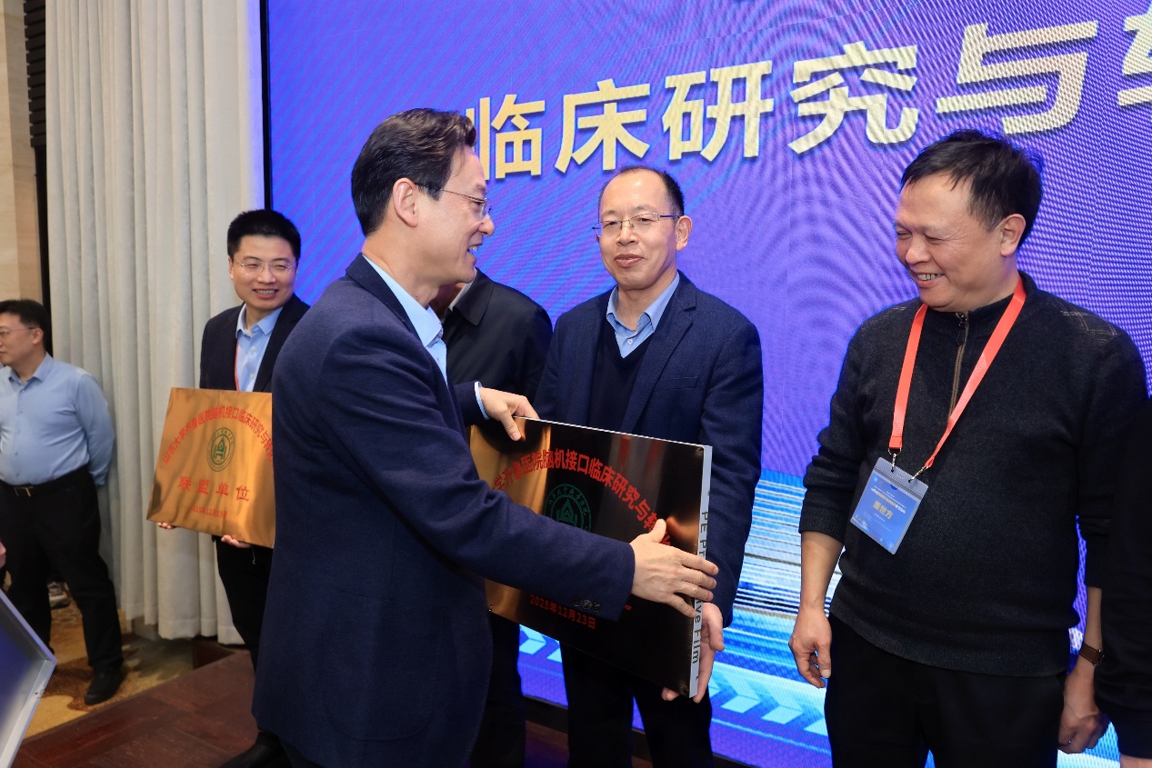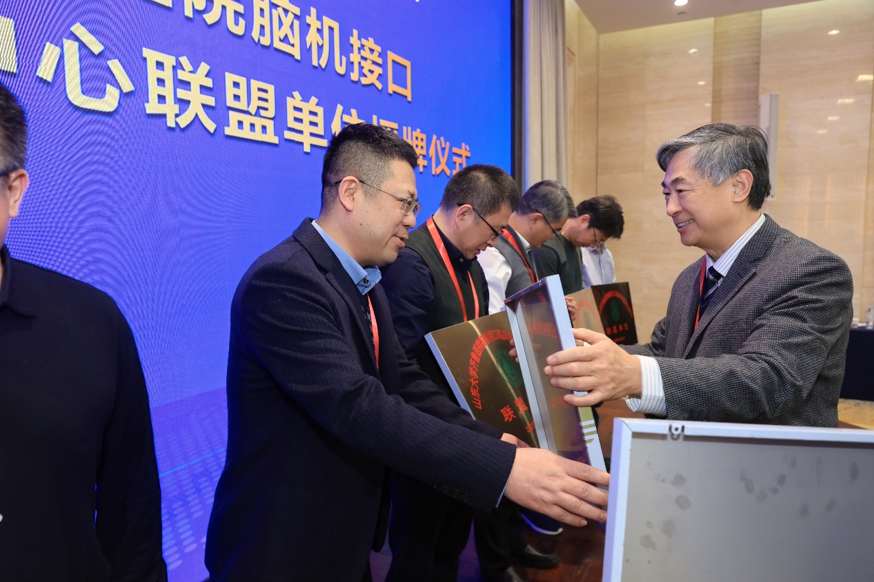 论坛还举行了山东大学齐鲁医院脑机接口临床研究与转化中心联盟单位的授牌仪式,山东大学齐鲁医院神经外科学术带头人李新钢教授、李刚教授,神经外科主任王东海教授共同为联盟单位授牌,标志着齐鲁医院与全省十六地市三十余家医院在脑机接口领域的紧密合作正式启动。此次联盟的成立,不仅是全省同道对齐鲁医学合作精神的认可,也是推动脑机接口技术创新与应用的重要里程碑。